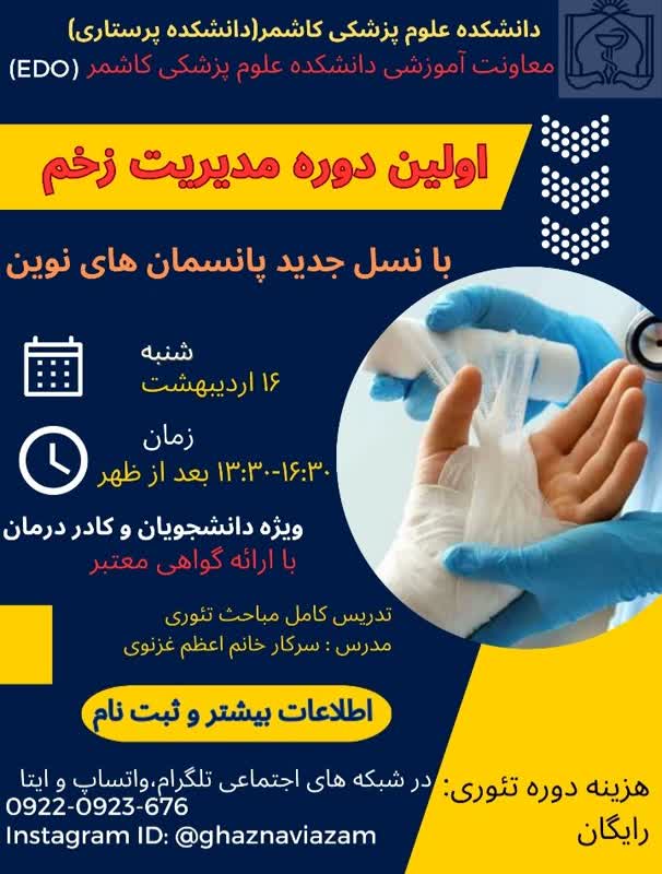 ثبت نام اولین دوره مدیریت زخم ( نسل جدید پانسمان های نوین) ویژه دانشجویان و کادر درمان با ارایه ی گواهی معتبر با همکاری EDO دانشکده علوم پزشکی کاشمر آغازشد. شروع کلاس در تاریخ 16 اردیبهشت از ساعت 13:30 لغایت 16:30