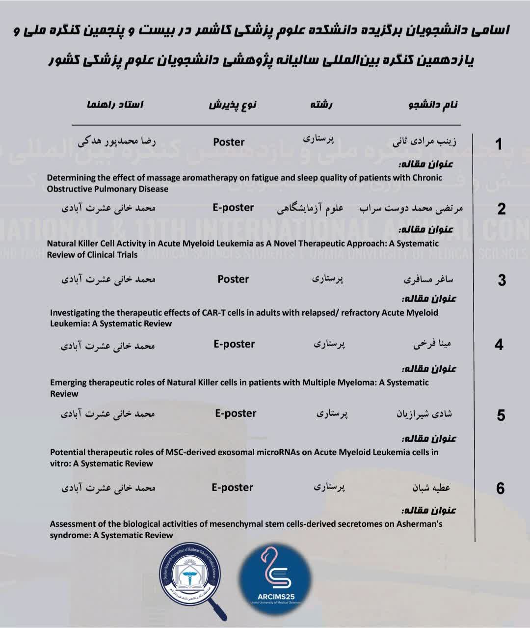 در بزرگترین و مهم ترین کنگره پژوهشی و فناوری دانشجویان علوم پزشکی کشور با توجه به اعلام رسمی 24مین کنگره ملی و 10مین کنگره بین المللی پژوهشی و فناوری دانشجویان علوم پزشکی کشور، تعداد 6 مقاله از مقالات ارسالی دانشجویان کمیته تحقیقات دانشجویی دانشکده علوم پزشکی کاشمر موفق به پذیرش در بخش Poster و E-poster شدند.