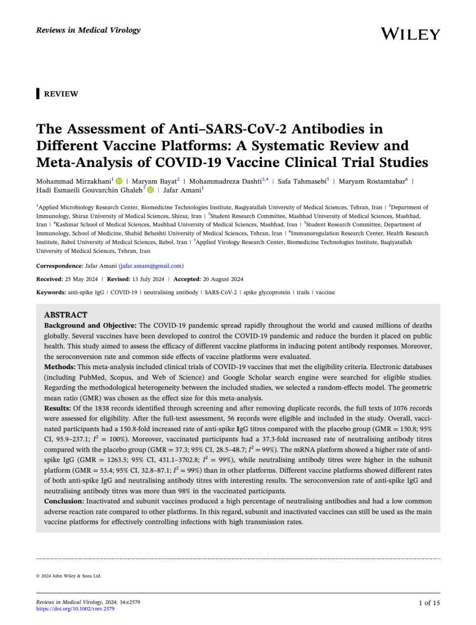 ویروس SARS-CoV-2 (عامل بیماری COVID-19) به سرعت در سراسر جهان گسترش یافت و باعث مرگ میلیون ها نفر در سراسر جهان شد. چندین واکسن برای کنترل همهگیری COVID-19 و کاهش باری که بر سلامت عمومی وارد میکند، ساخته شدهاند. این مطالعه با هدف ارزیابی اثربخشی پلت فرم های مختلف واکسن در القای پاسخ های سیستم ایمنی همورال انجام شد. علاوه بر این، میزان تیتر آنتی بادی (seroconversion rate) و عوارض جانبی (side effects) رایج پلتفرمهای واکسن مورد ارزیابی قرار گرفت. نتیجه مطالعه نشان داد که واکسنهای غیرفعال و زیرواحد، درصد بالایی از آنتیبادیهای خنثیکننده (neutralising antibodies) تولید میکنند و عوارض جانبی نامطلوب پایینی در مقایسه با سایر پلتفرمها دارند. در این راستا، واکسنهای زیرواحد و غیرفعال شده همچنان میتوانند بهعنوان بسترهای اصلی واکسن برای کنترل مؤثر عفونتها با نرخ انتقال بالا، مورد استفاده قرار گیرند. این مقاله به نویسندگی محمدرضا دشتی عضو هیئت علمی دانشکده علوم پزشکی کاشمردر مجله Reviews in Medical Virology با ایمپکت فاکتور 9 به چاپ رسیده است.