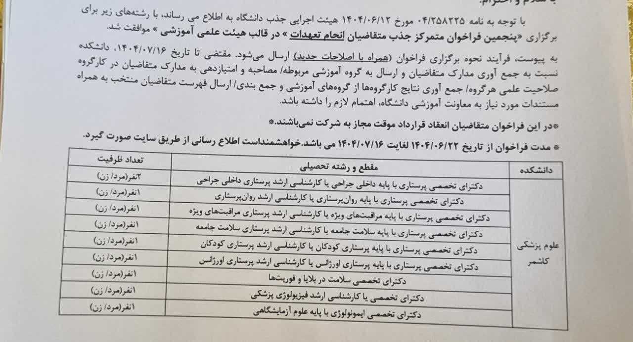 مدت فراخوان متقاضیان از تاریخ 22 شهریور لغایت 16 مهر می باشد. متقاضیان رشته های مورد نیاز می توانند با ارایه ی مدارک به دکتر فرزاد رحمانی معاونت آموزشی و پژوهشی دانشکده علوم پزشکی کاشمر مراجعه نمایند.