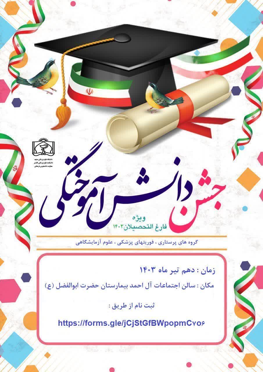 قابل توجه تمامی دانش آموختگان دانشکده علوم پزشکی کاشمر که تاریخ فارغ التحصیلی آنان سال 1403 می باشد با عنایت به مصوبه کمیته برگزاری مراسم دانش آموختگی ، این مراسم در تیر ماه 1403 برگزار خواهد گردید . زمان برگزاری : یکشنبه 10 تیر ماه ، ساعت 10 لغایت 13