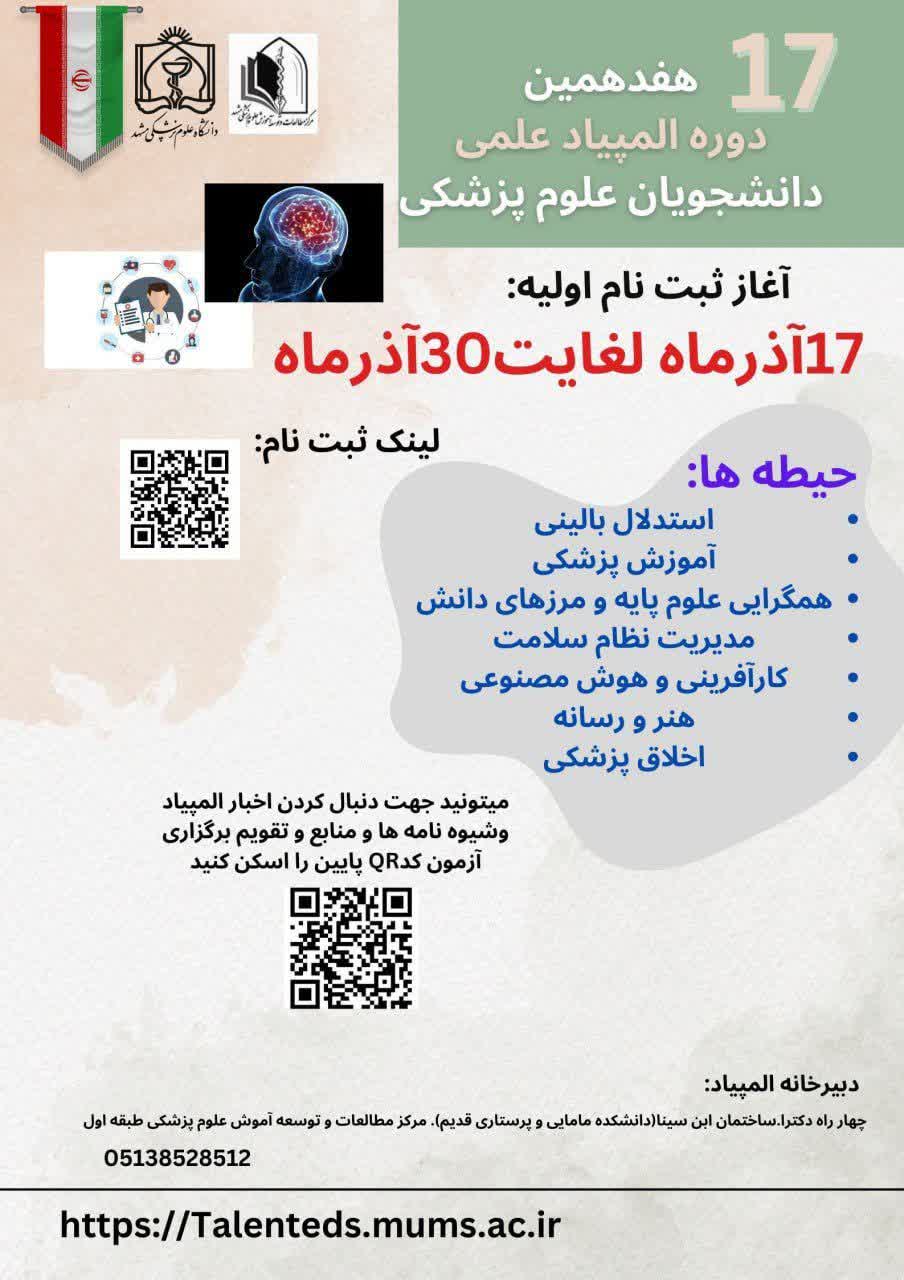اطلاعیه 18 آذر 1403 امتیاز: ( 0 Rating ) آغاز ثبت نام هفدهمین دوره المپیاد دانشجویان علوم پزشکی امتیاز کاربران لطفا رای دهید رای 1 رای 2 رای 3 رای 4 رای 5 ثبت نام : از تاریخ ۱۷ آذرماه لغایت ۳۰ آذر ماه شرایط شرکت کنندگان متعاقبا اعلام می شود. میتوانید با مراجعه به سایت زیر نسبت به ثبت نام اقدام کنید. https://talenteds.mums.ac.ir/index.php/olympia/registration 18 آذر 1403 بازدید: 128 امتیاز: ( 0 Rating )